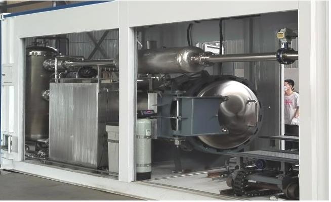 醫(yī)療廢物裝載進入滅菌車,進入高溫蒸氣滅菌艙,艙門自動關閉、鎖緊,程控操作啟動,抽出不可凝空氣,充入飽和蒸汽使滅菌設備內(nèi)溫度達到134℃,自動計時消毒45分鐘,抽出艙體內(nèi)高溫蒸汽,艙門開啟,然后對處理過的垃圾進行提升粉碎毀形后輸出。